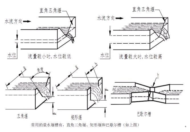 常用(yòng)的(de)量水(shuǐ)堰槽有(yǒu):三角堰、矩形堰和(hé)巴歇爾槽。